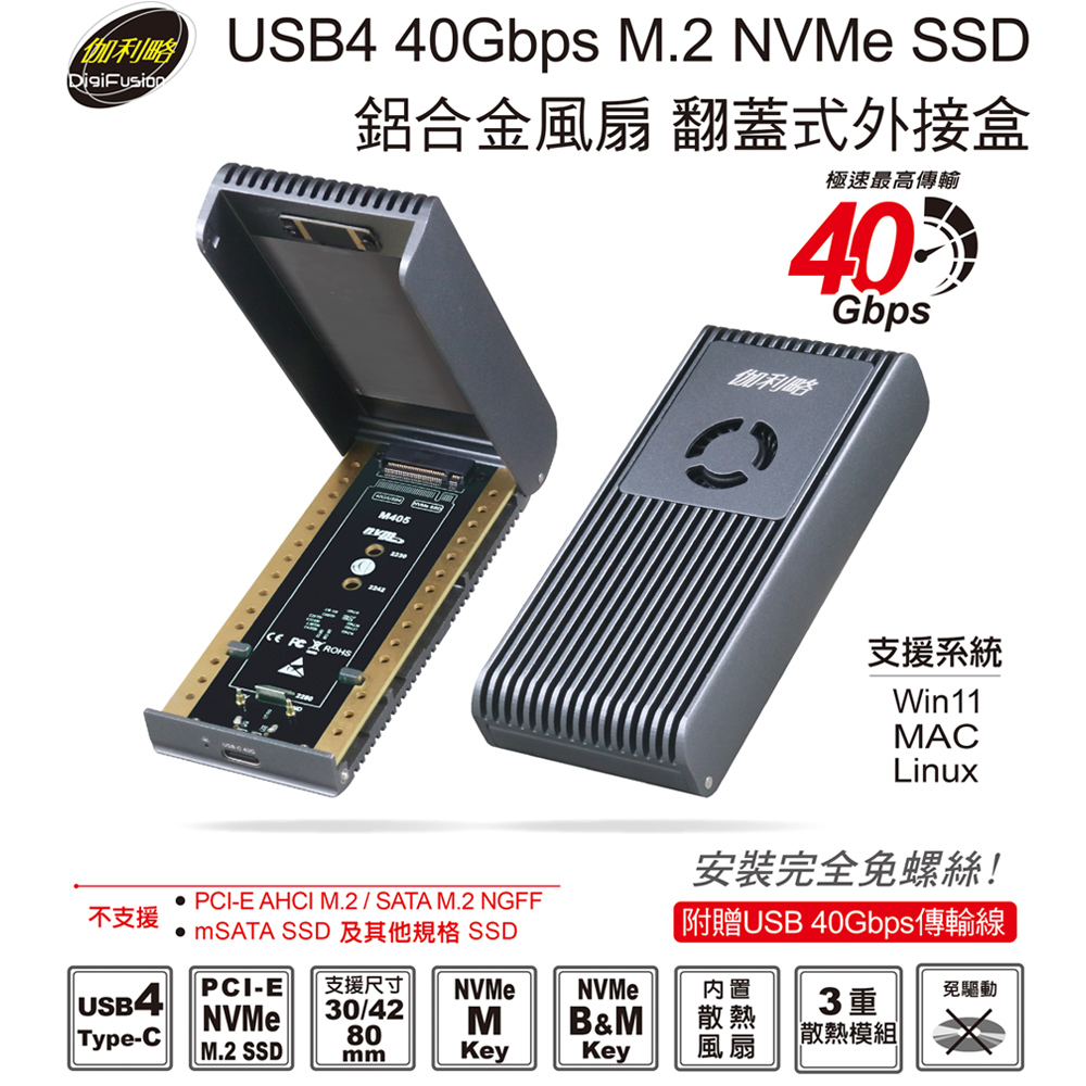 伽利略 USB4 40Gbps M.2 NVMe SSD 鋁合金風扇 翻蓋式外接盒