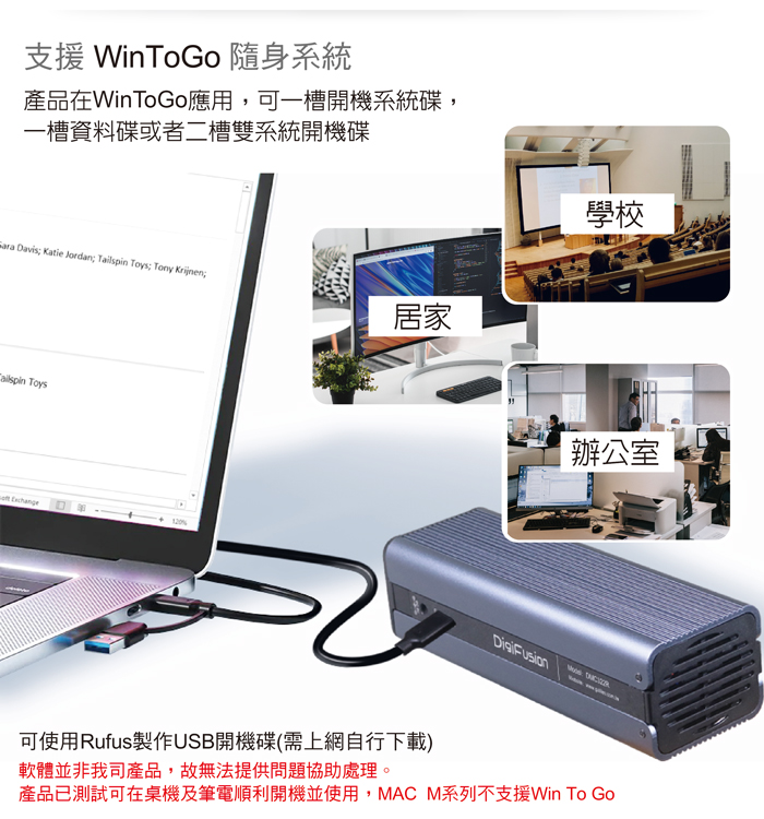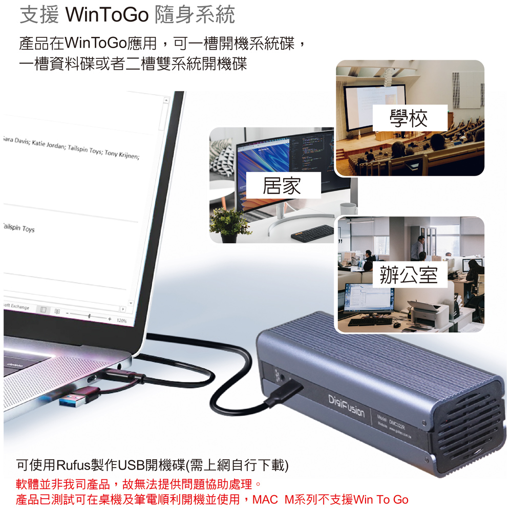 ● 支援WinToGo隨身系統,可使用rufus製作