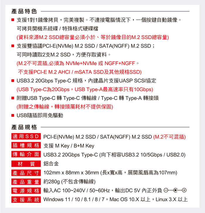 ● 支援雙協議PCI-E(NVMe) M.2 SSD / SATA(NGFF) M.2 SSD