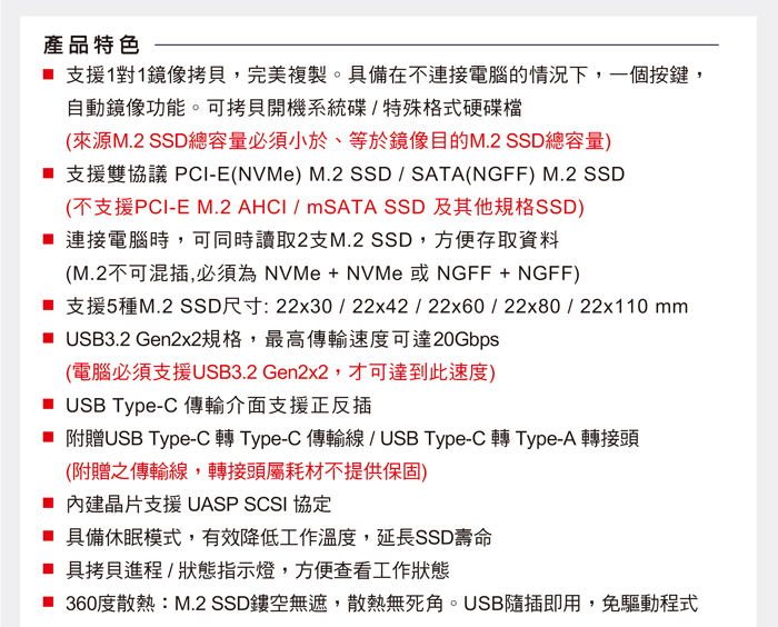 ● 支援雙協議PCI-E(NVMe) M.2 SSD / SATA(NGFF) M.2 SSD