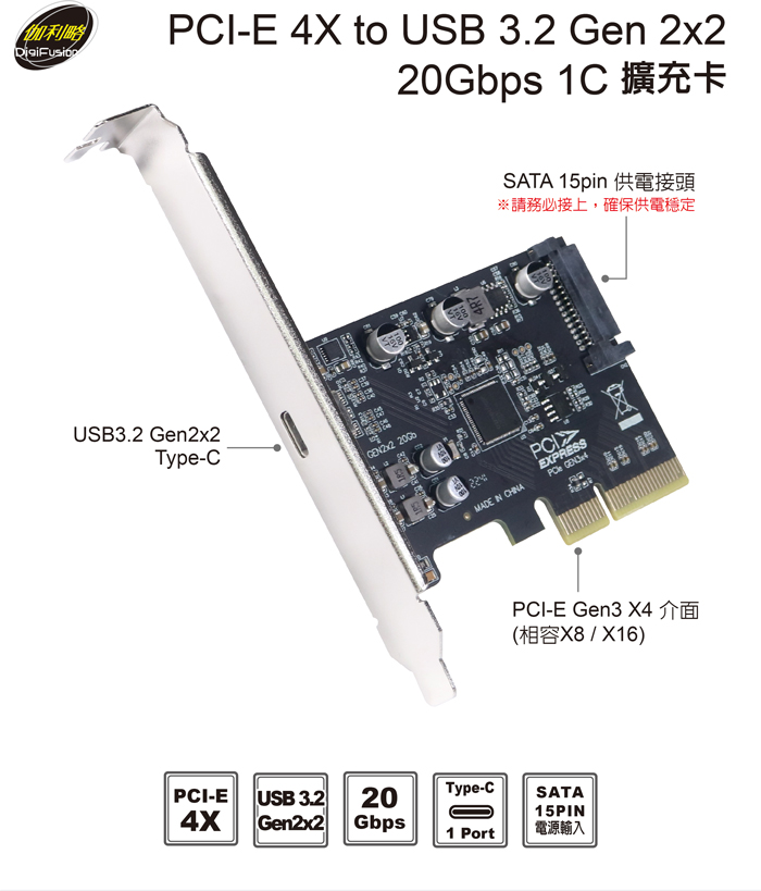 伽利略 PCI-E 4X to USB3.2 Gen2x2 20Gbps 1C 擴充卡