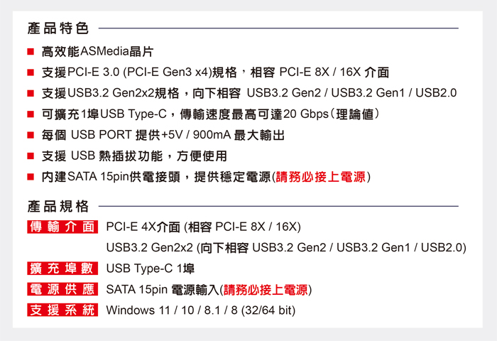 ● 支援USB熱插拔功能。內建SATA 15pin供電接頭
