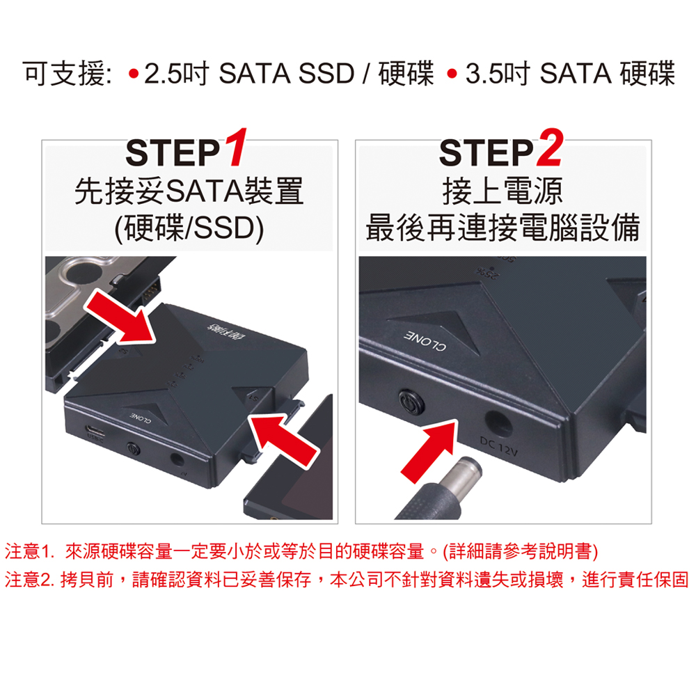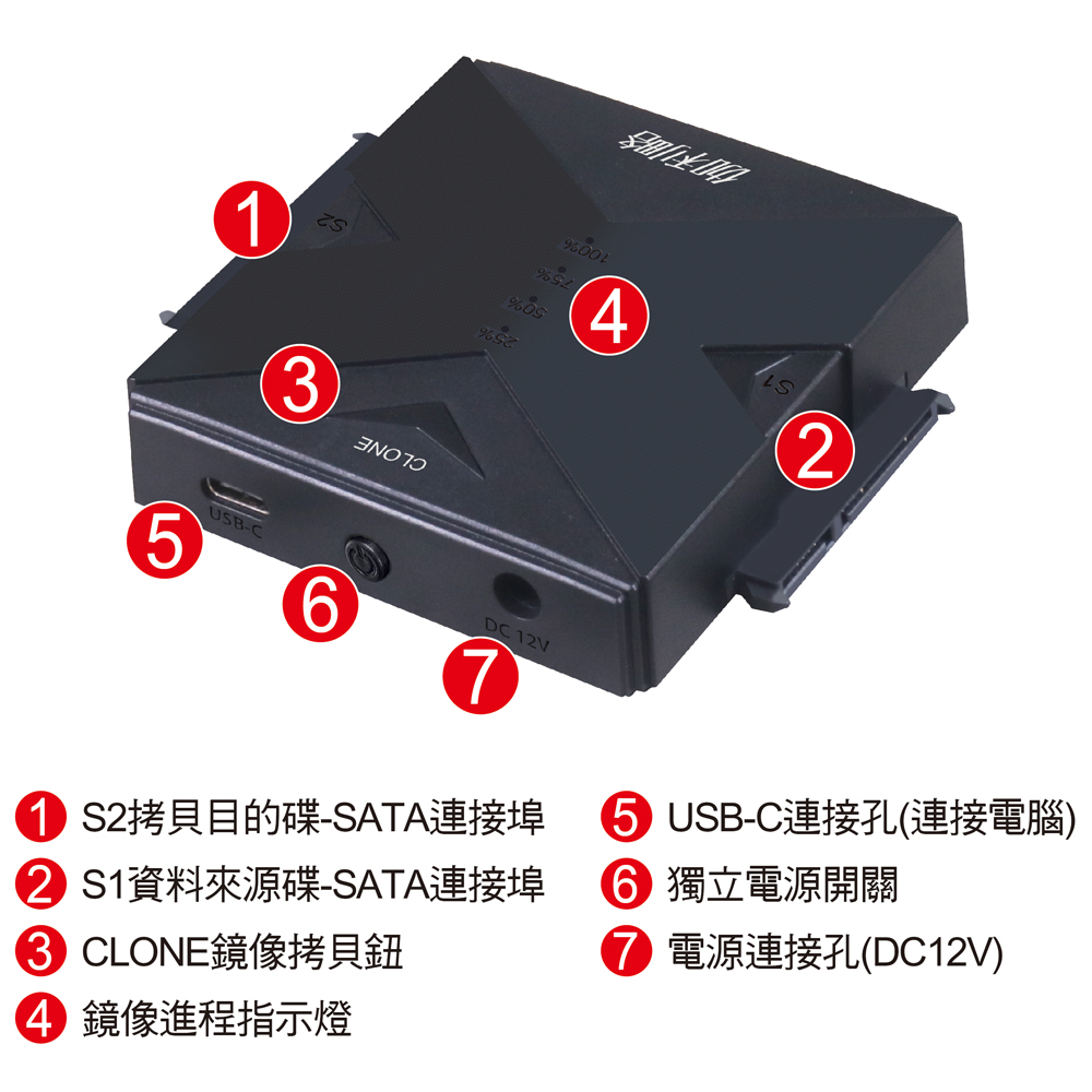 ● 支援SATA HDD/SSD硬碟對拷,一鍵鏡像,無需電腦。