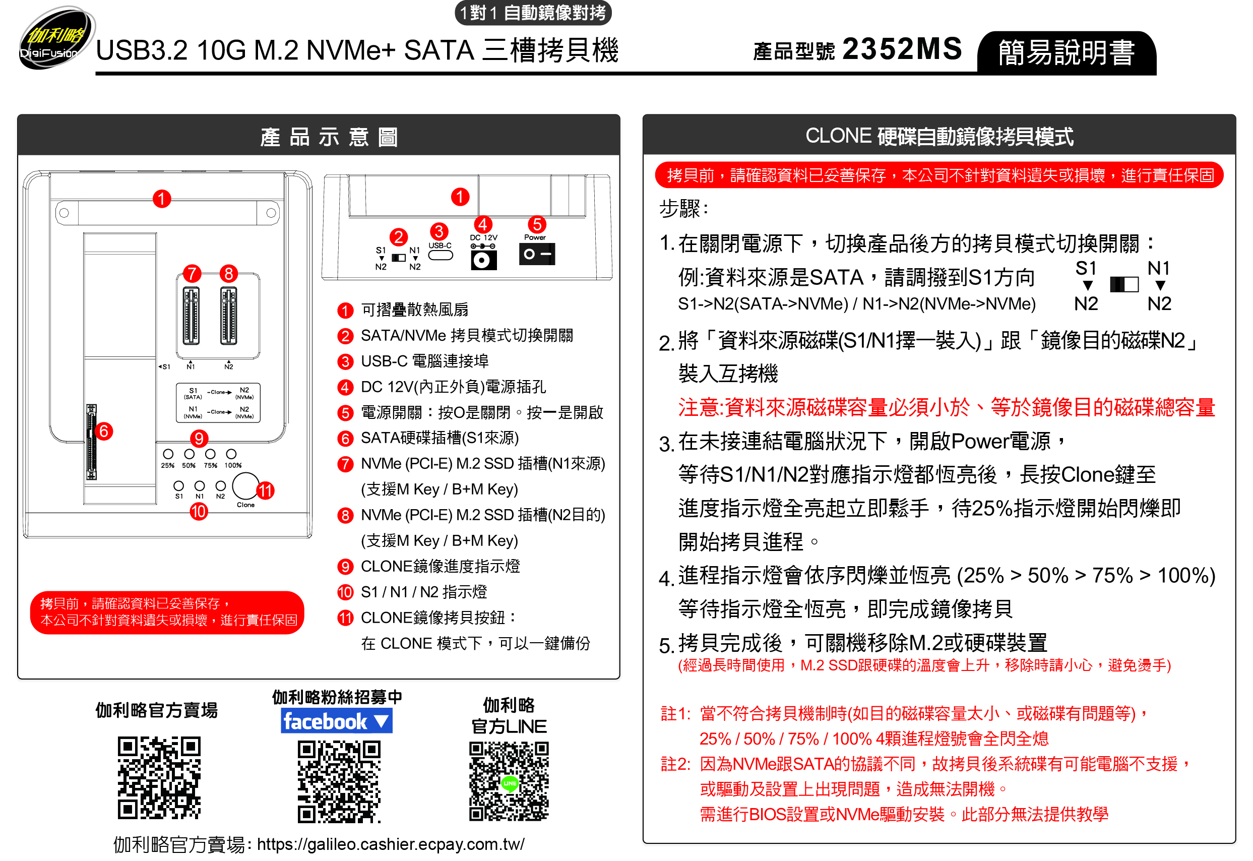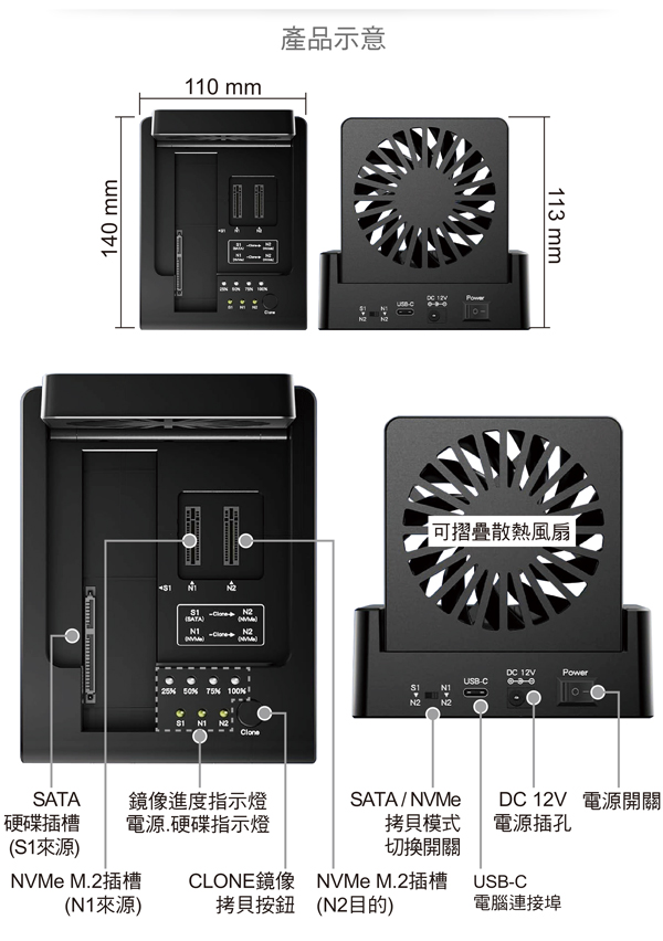 - 支援 SATA 對 NVMe M.2 或 NVMe M.2 對 NVMe M.2 鏡像拷貝