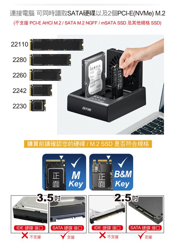 - 支援5種SSD尺寸: 22x30 / 22x42 / 22x60 / 22x80 / 22x110 mm
