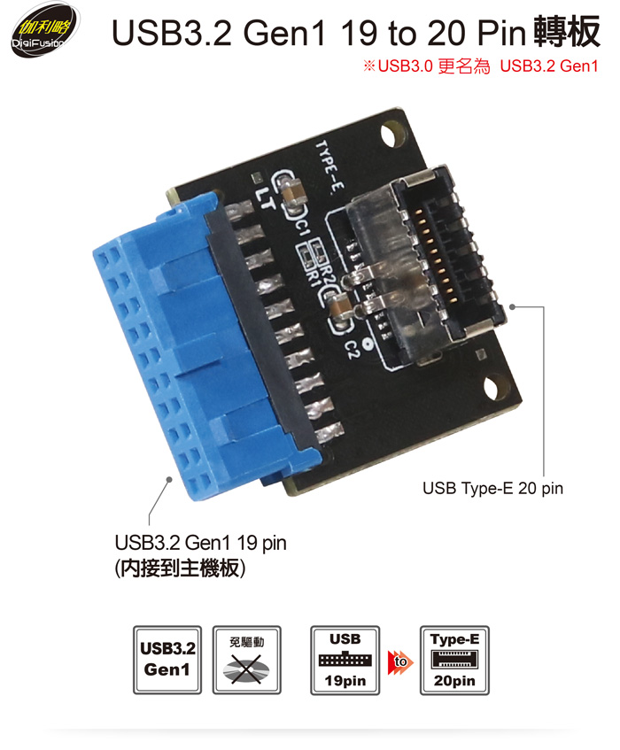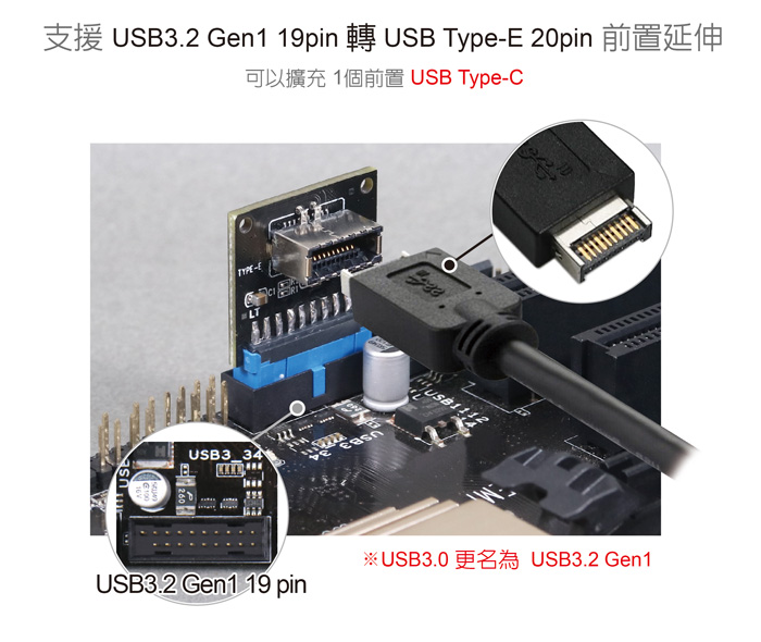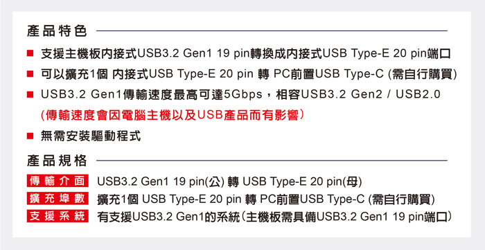 ● 支援USB3.2 Gen1 19Pin轉USB Type-E 20pin端口