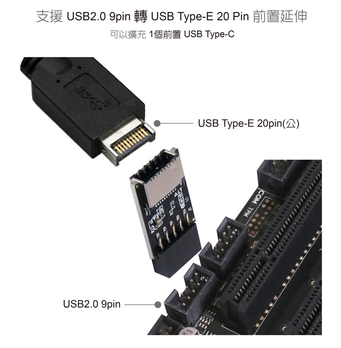 ● 支援 USB2.0 9pin 轉 USB Type-E 20pin 端口