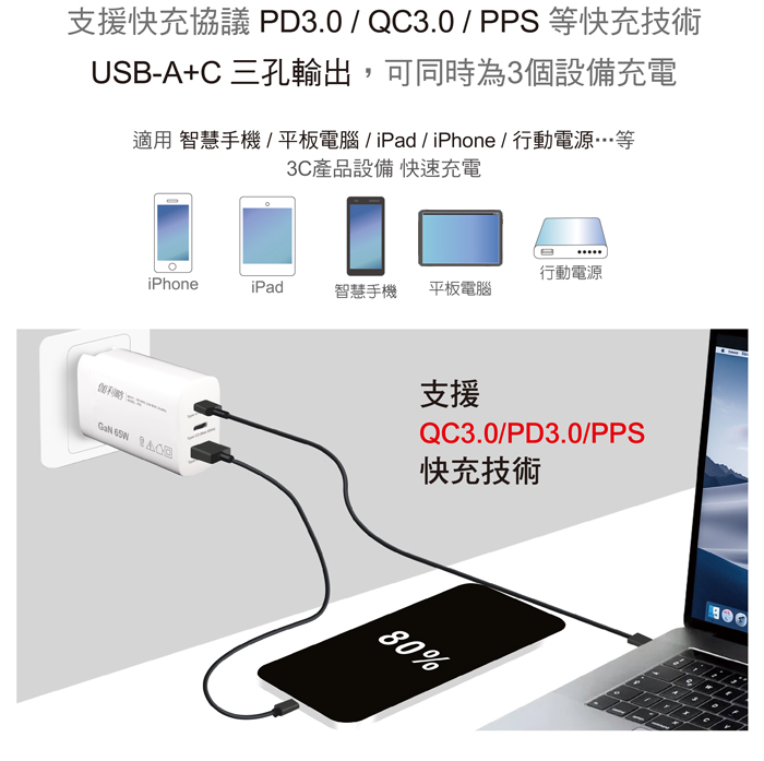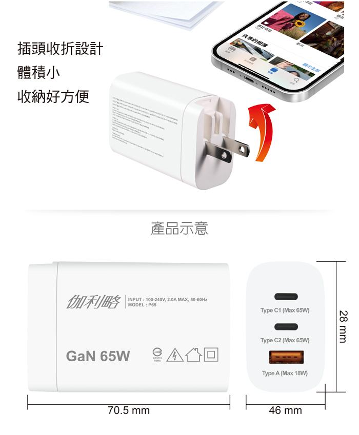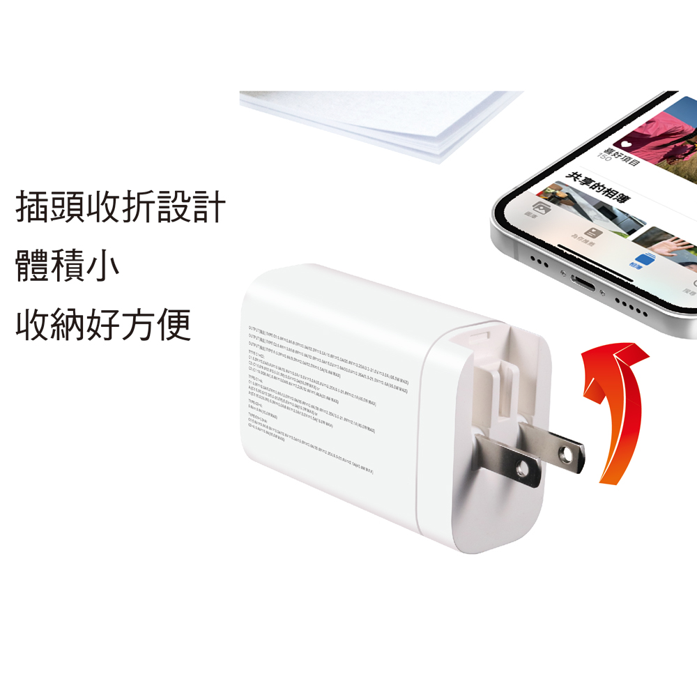● 採用氮化鎵科技,體積小、充電快,不易發燙