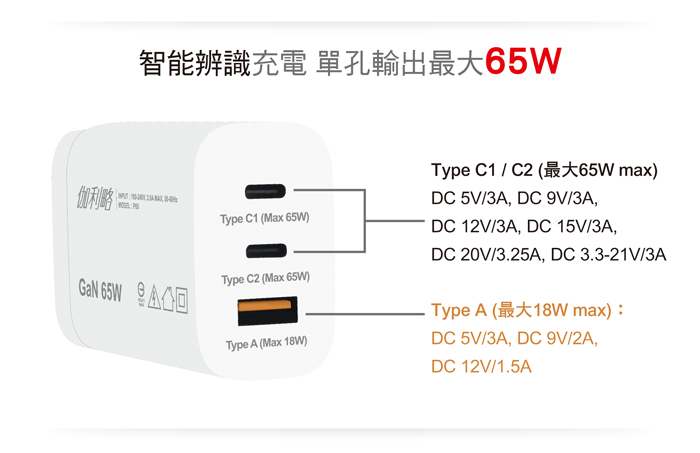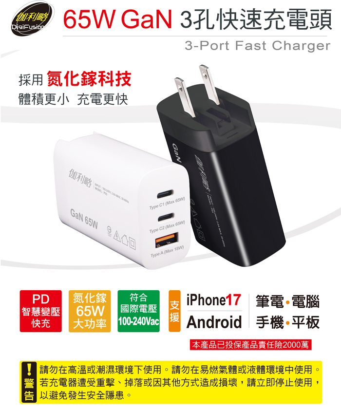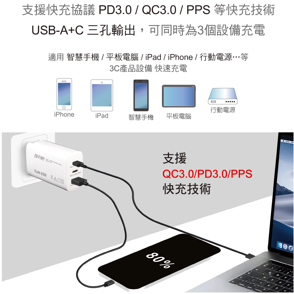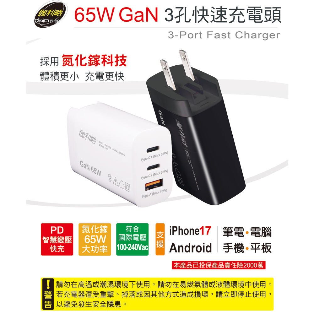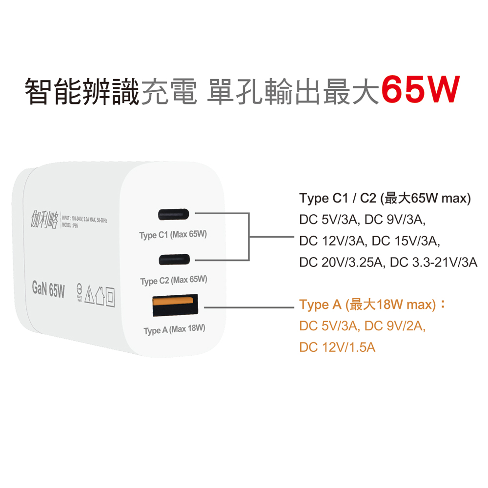 伽利略 65W GaN氮化鎵 3孔快速充電頭