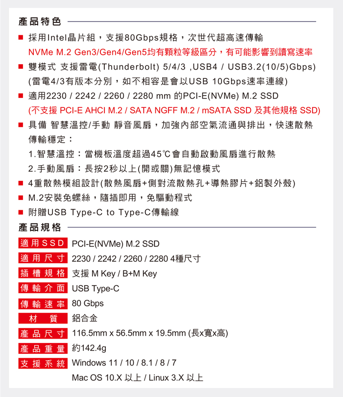 ● 雙模式:支援雷電(Thunderbolt) 5/4/3 ,USB4/USB3.2(10/5 Gbps)