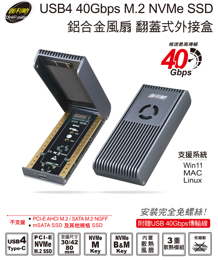伽利略 USB4 40Gbps M.2 NVMe SSD 鋁合金風扇 翻蓋式外接盒