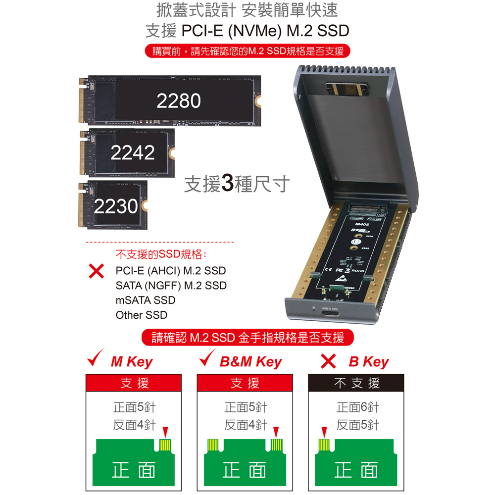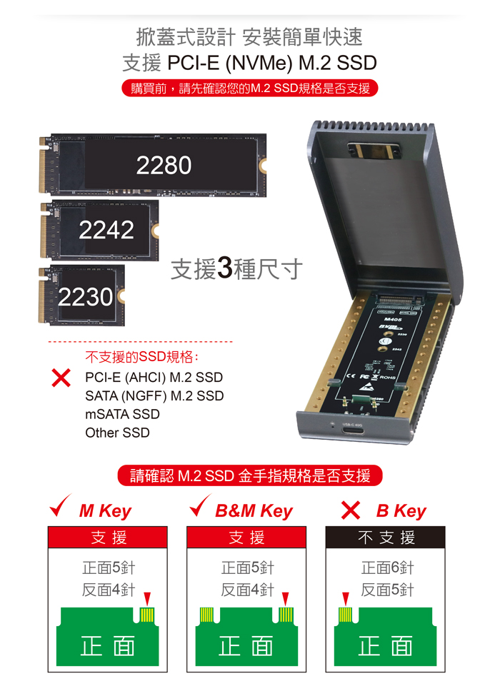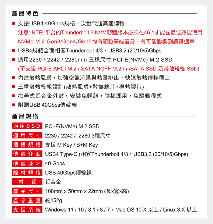 ● 適用2230 / 2242 / 2280mm 三種尺寸PCI-E(NVMe) M.2
