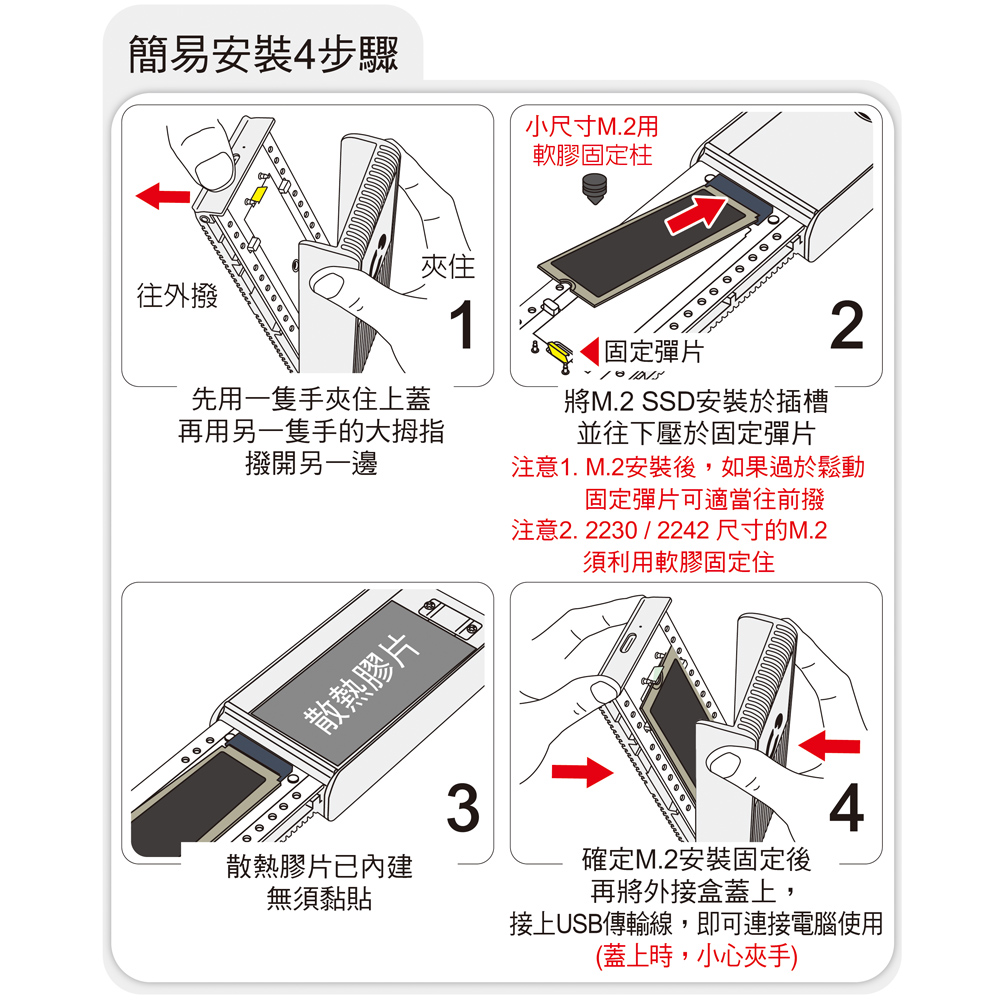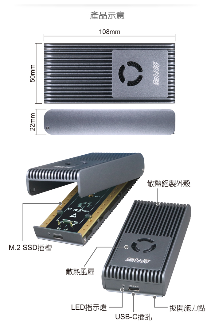 ● 掀蓋式鋁合金外殼,安裝免螺絲,隨插即用