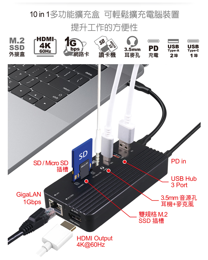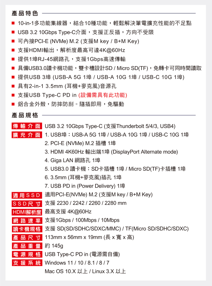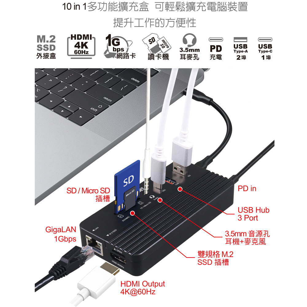 ● 10-in-1多功能集線器,USB 3.2 10Gbps Type-C介面