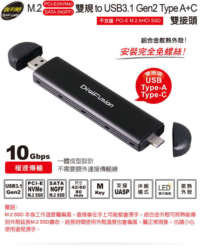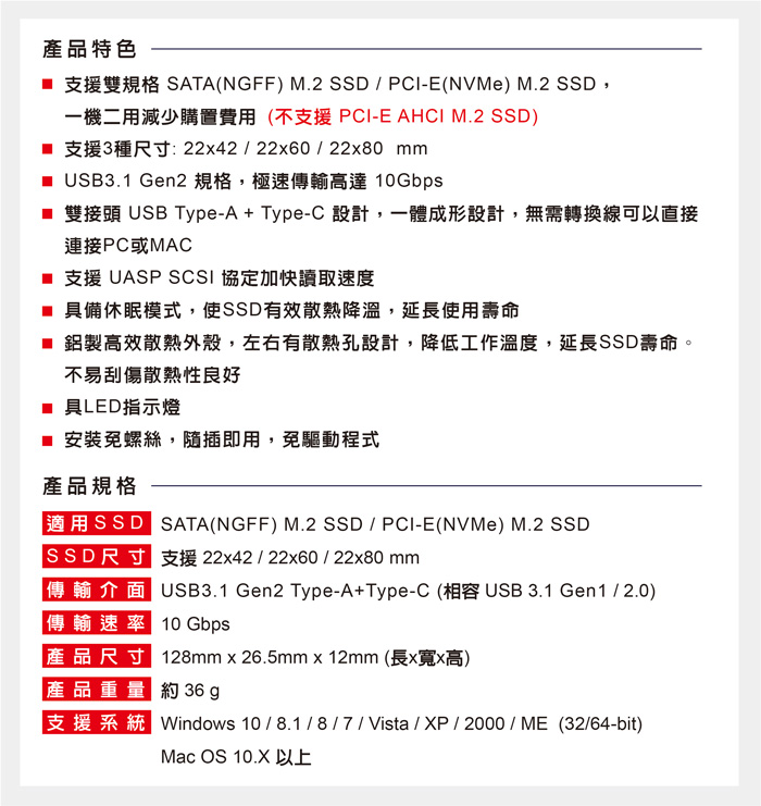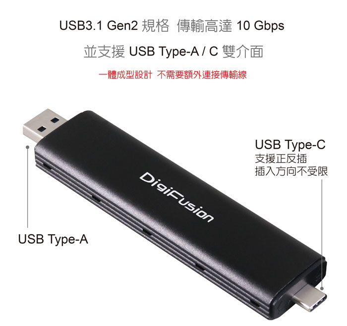 ● USB3.2 Gen2 10Gbps規格,Type-A/C 雙介面