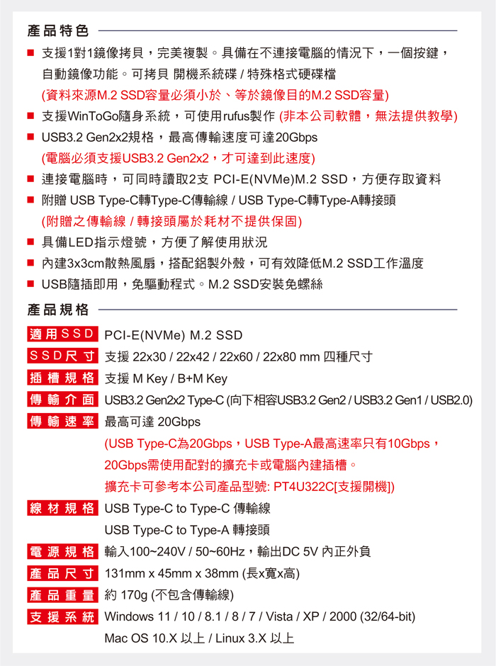 ● USB3.2 Gen2x2規格,傳輸速度可達20Gbps(電腦必須支援)