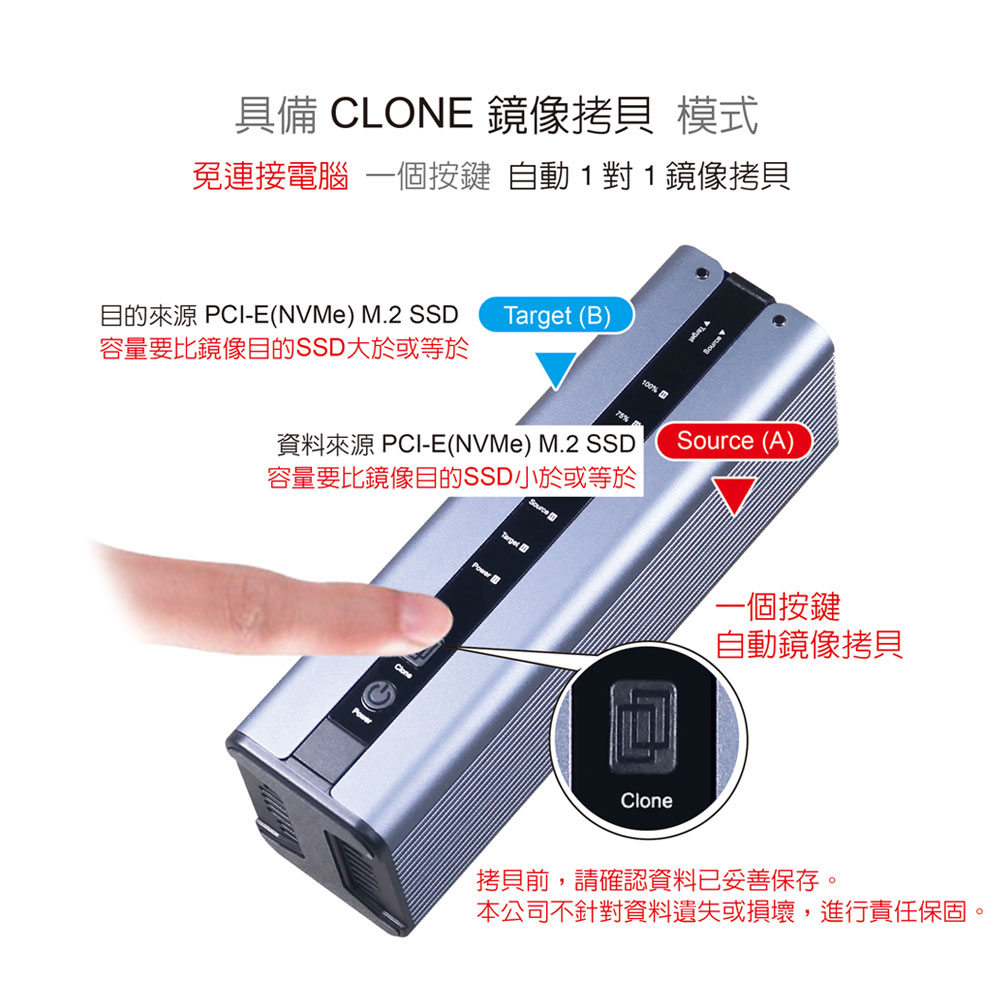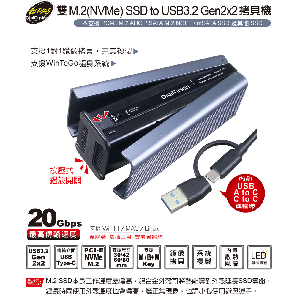伽利略 雙M.2(NVMe) SSD to USB3.2 Gen2x2 拷貝機