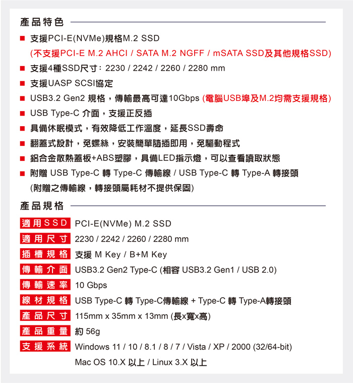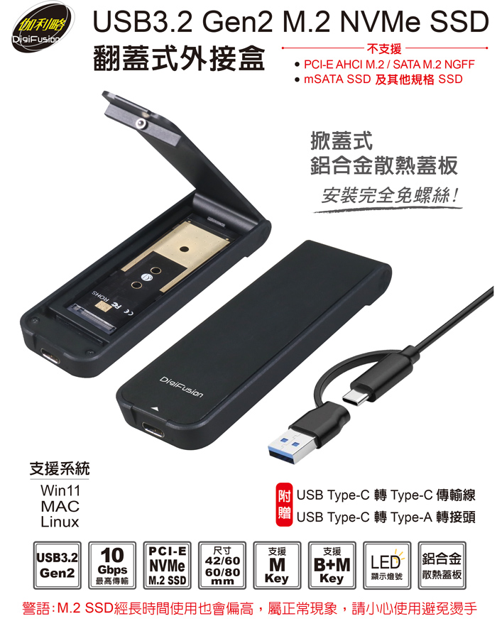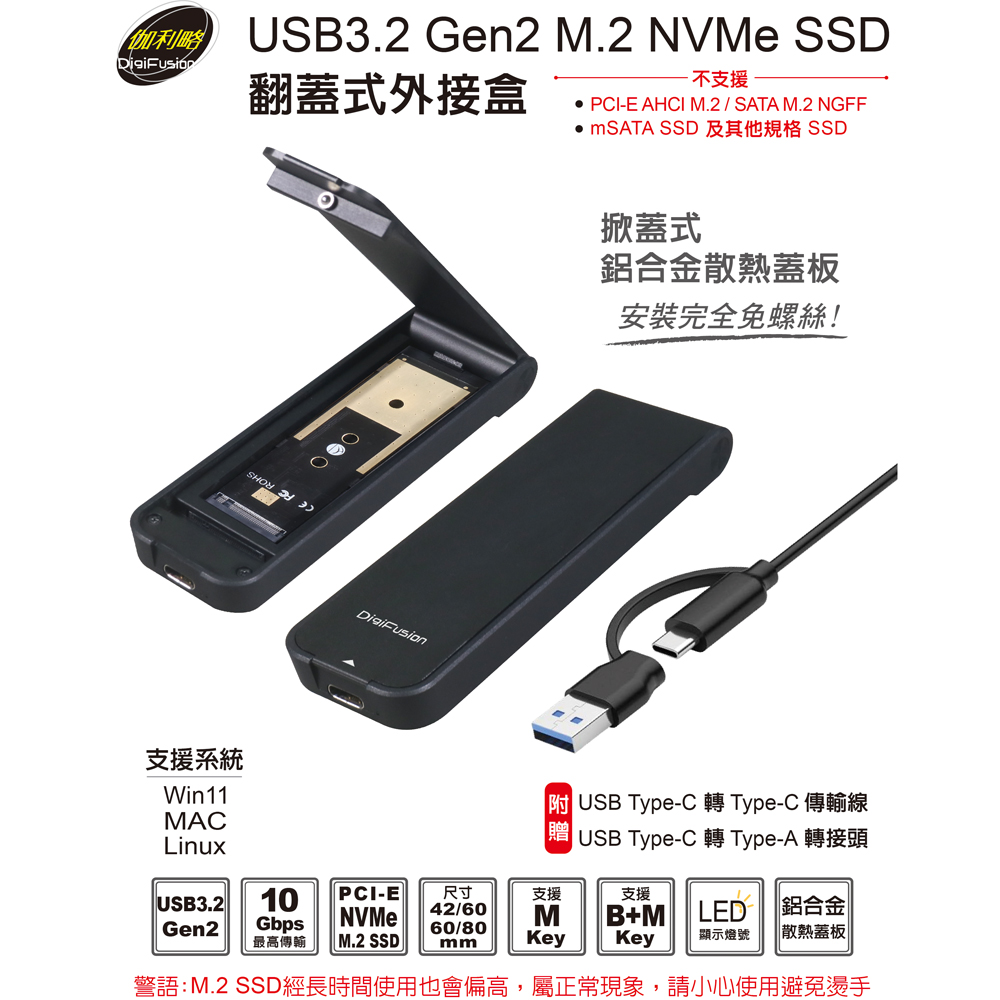 伽利略USB3.2 Gen2 M.2 NVMe SSD 翻蓋式外接盒 (附C+A傳輸線)
