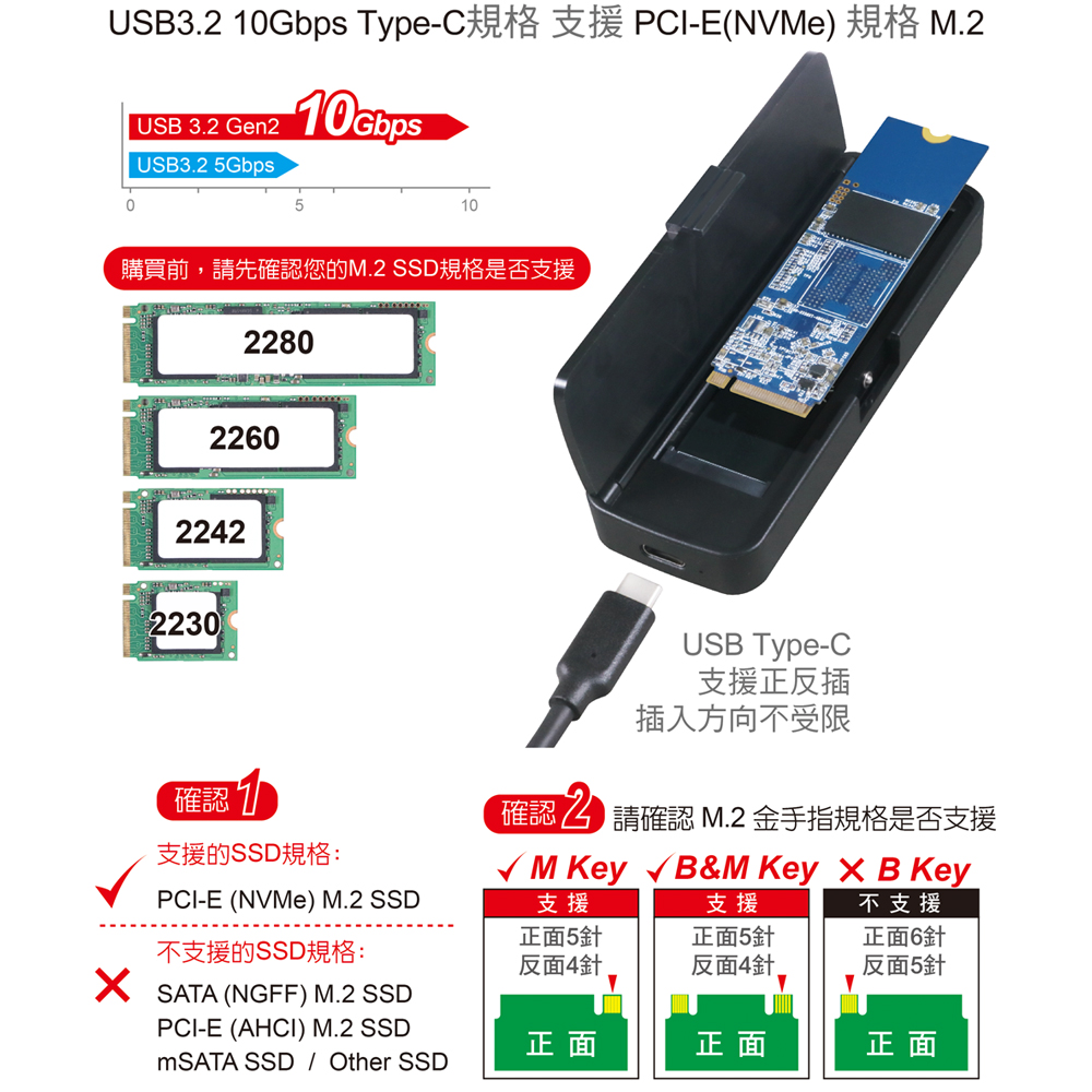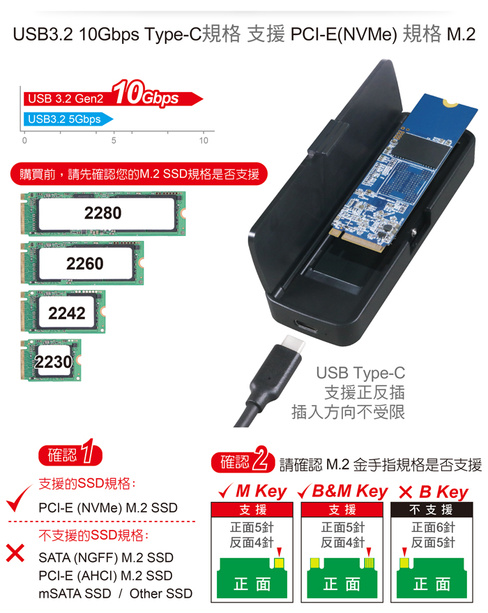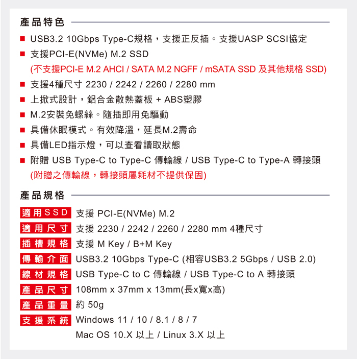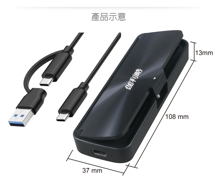 ● USB3.2 10Gbps Type-C規格,支援正反插。支援UASP SCSI協定