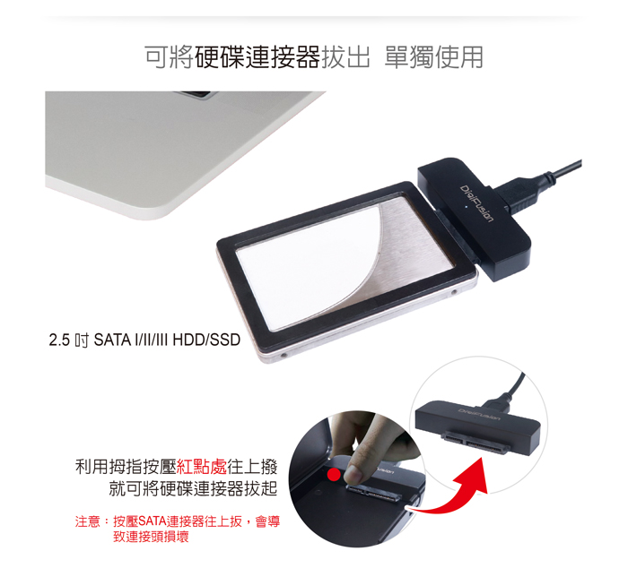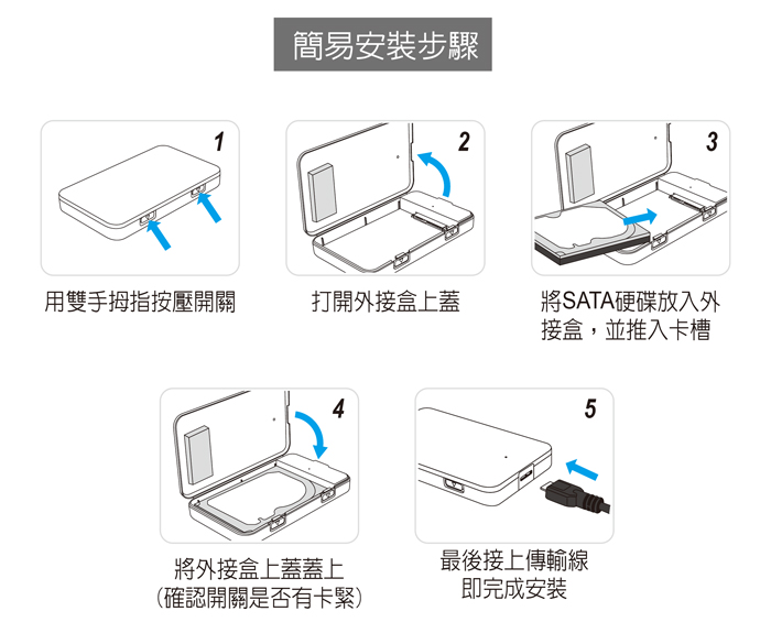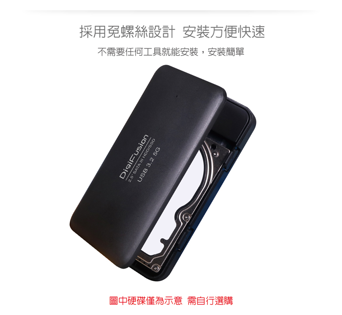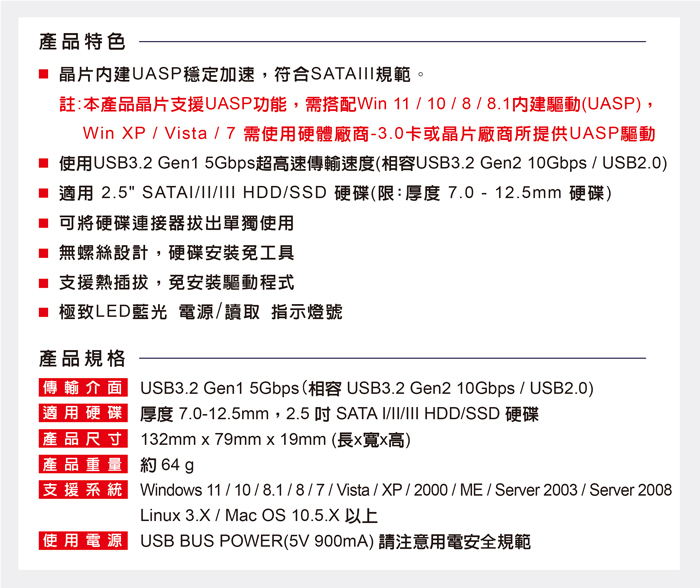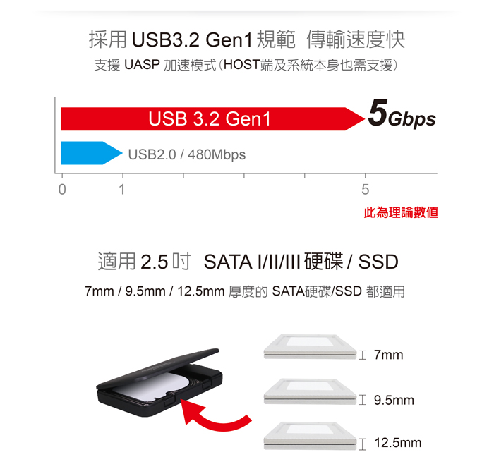 ● 適用2.5吋 SATA SSD/硬碟,支援厚度7.0-12.5mm硬碟