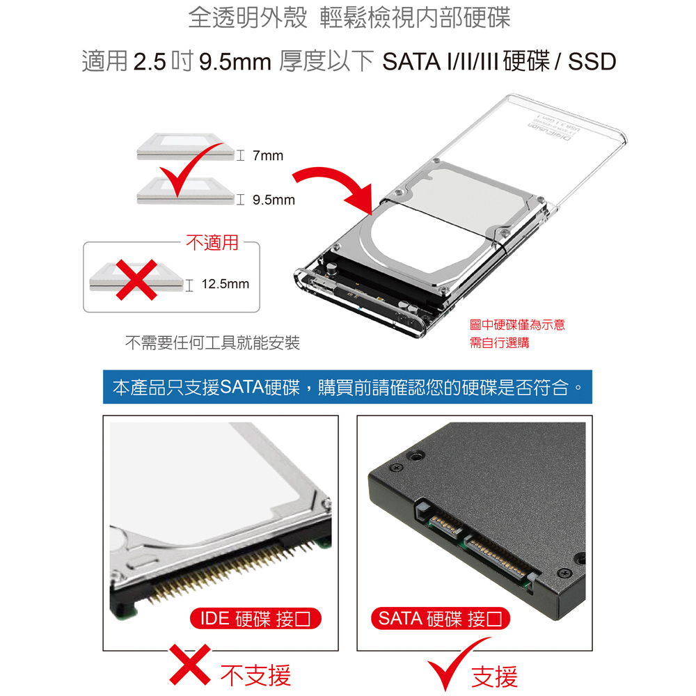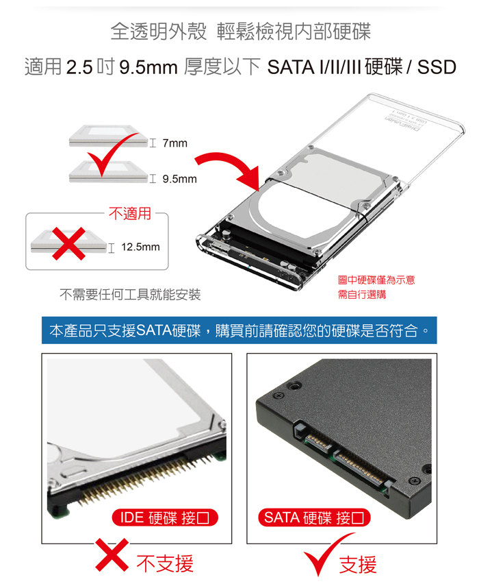 ● 適用2.5吋 SATA SSD/硬碟,支援厚度9.5mm以下硬碟