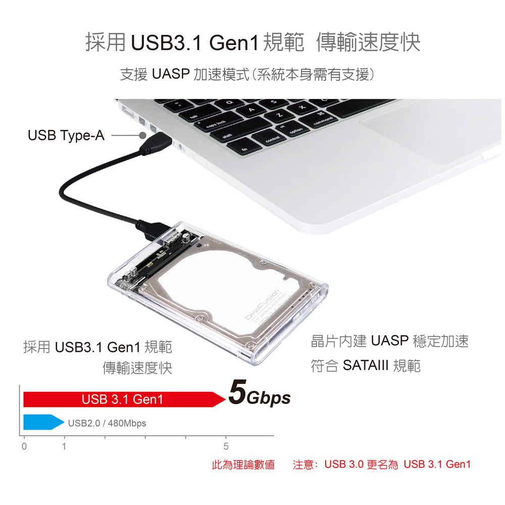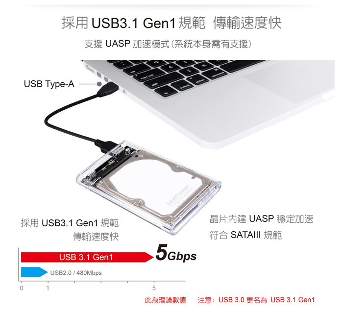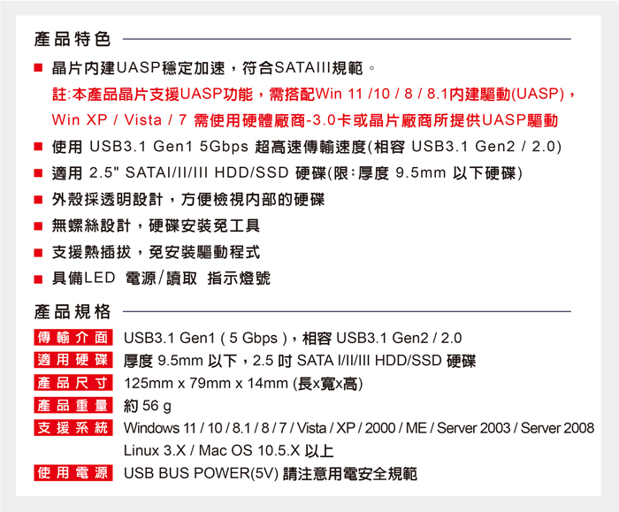 ● USB3.2 Gen1 5Gbps 規格,晶片內建UASP穩定加速