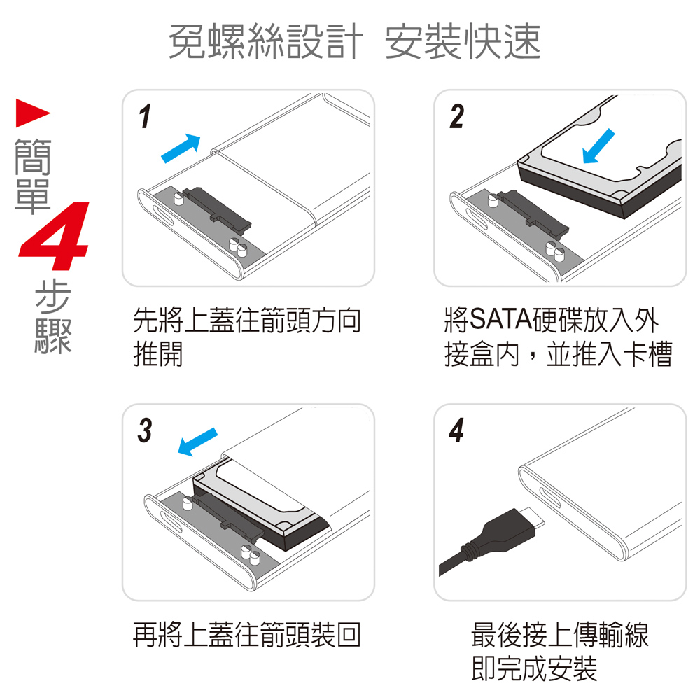 ● 無螺絲設計,硬碟安裝免工具