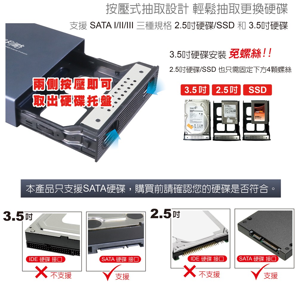 ● 支援SATA 2.5吋硬碟/SSD,SATA3.5吋硬碟(支援20TB以上)