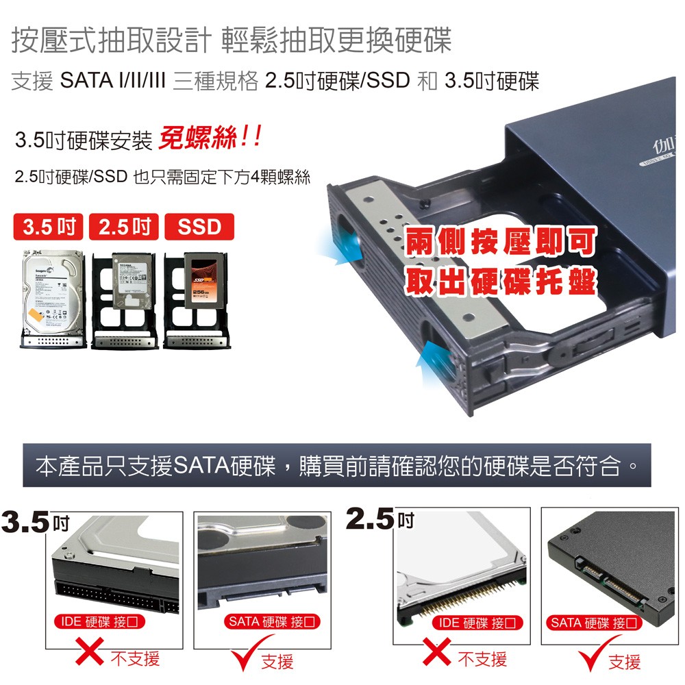 ● 支援SATA 2.5吋硬碟/SSD,SATA3.5吋硬碟(支援20TB以上)