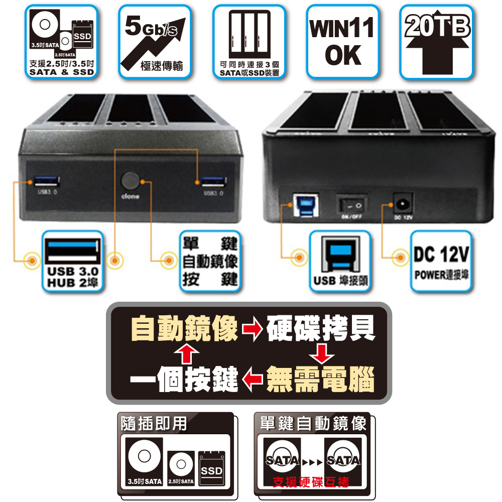 伽利略 USB3.1 Gen1 2.5/3.5" 3插槽 SATA 硬碟拷貝機