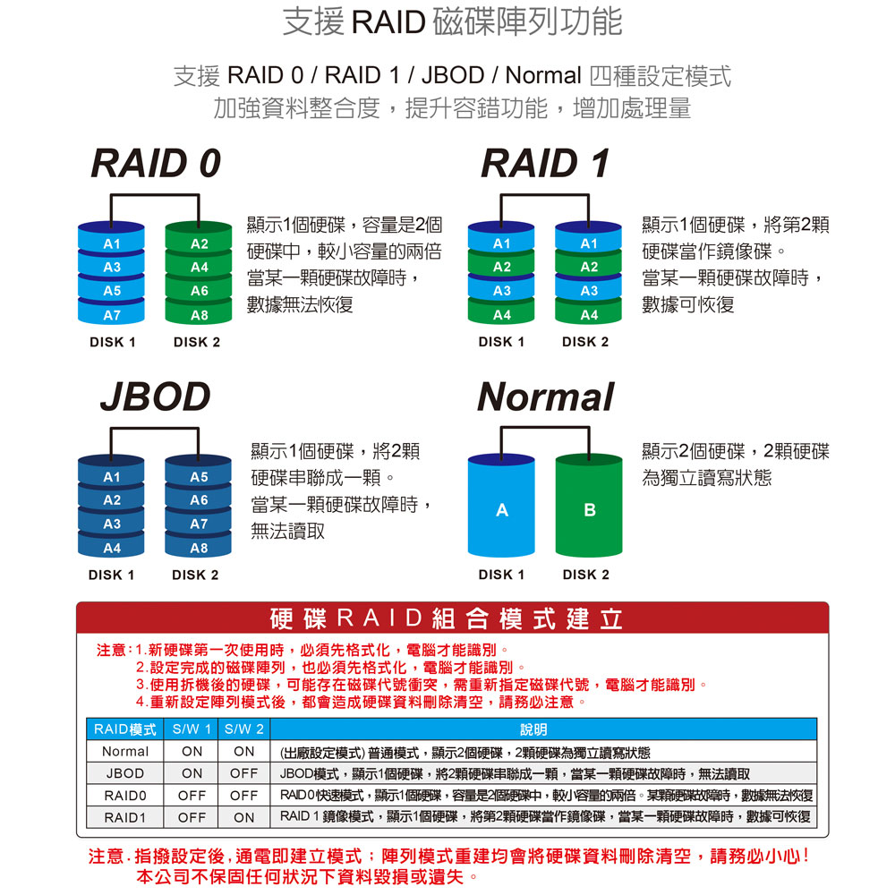 ● 支援RAID 0/1, JBOD/Normal 四種設定模式