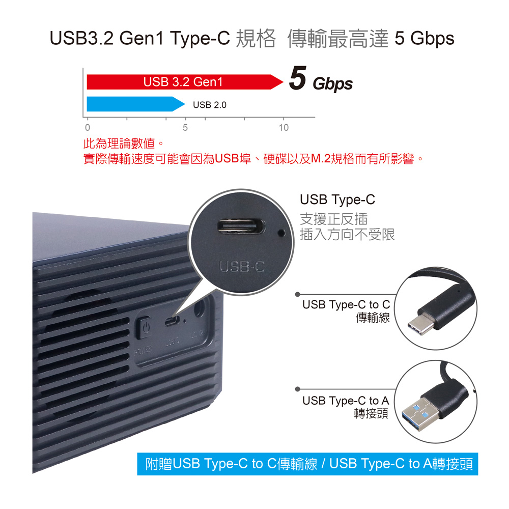 ● USB3.2 Gen1 Type-C規格,速度最高可達到5Gbps