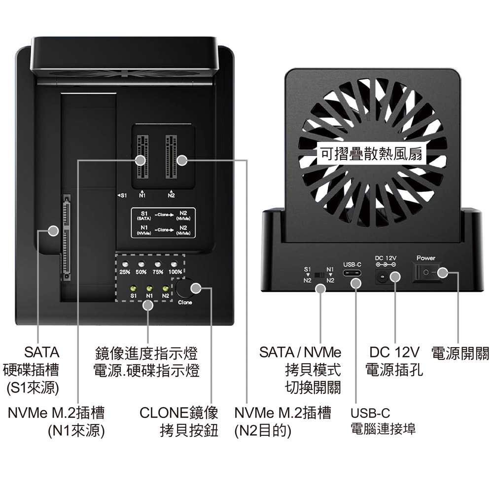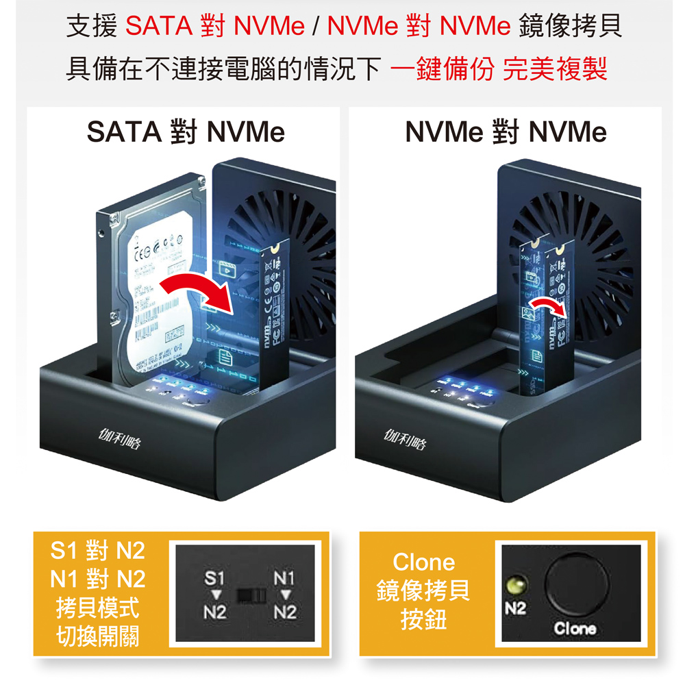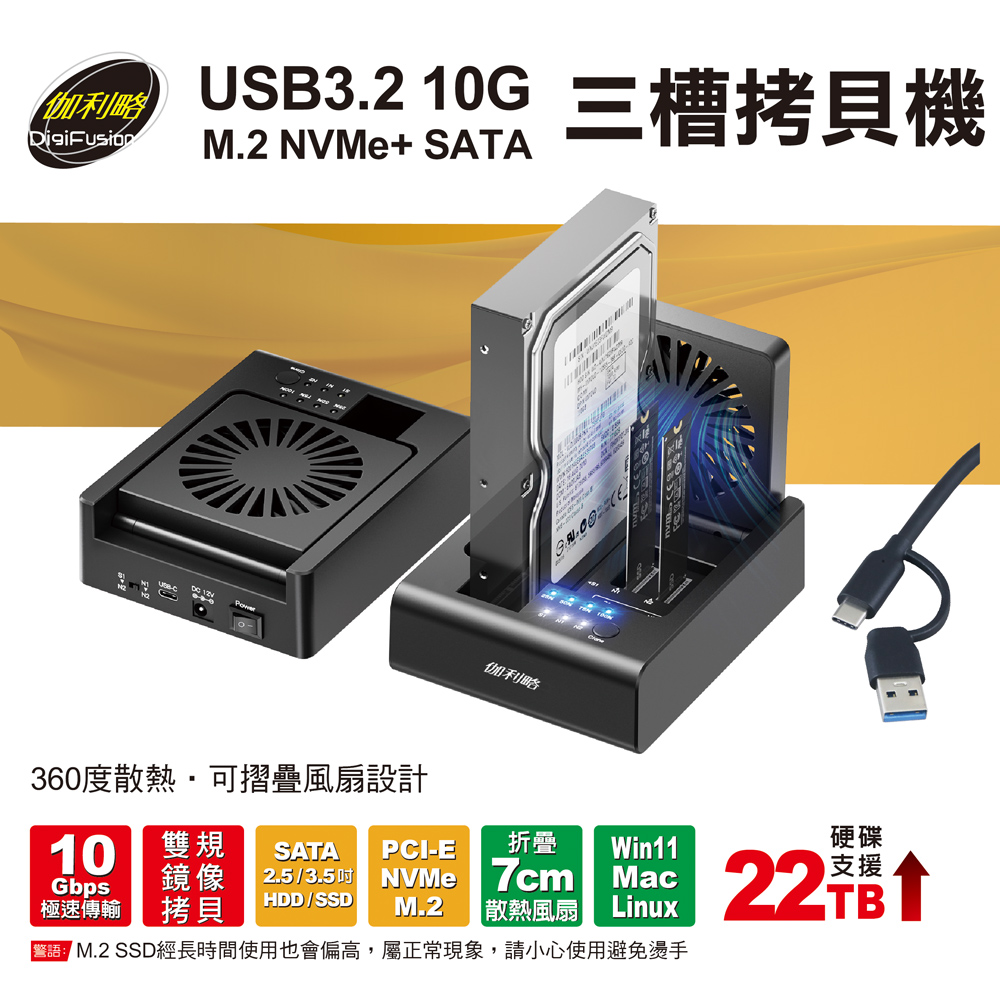 伽利略 USB3.2 10G M.2 NVMe+ SATA 三槽拷貝機