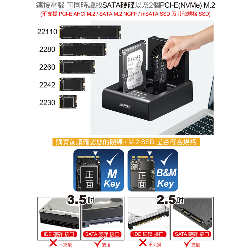 ● 連接電腦時,可同時讀取SATA硬碟以及2個PCI-E(NVMe)M.2