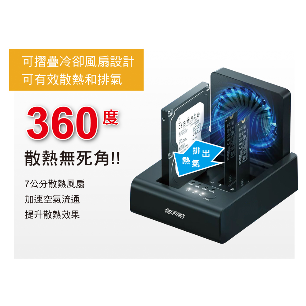 ● 具有7公分散熱風扇。硬碟、M.2安裝免螺絲。隨插即用免驅動