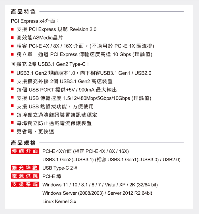 ● 高效能ASMedia晶片,PCI-E 4X介面