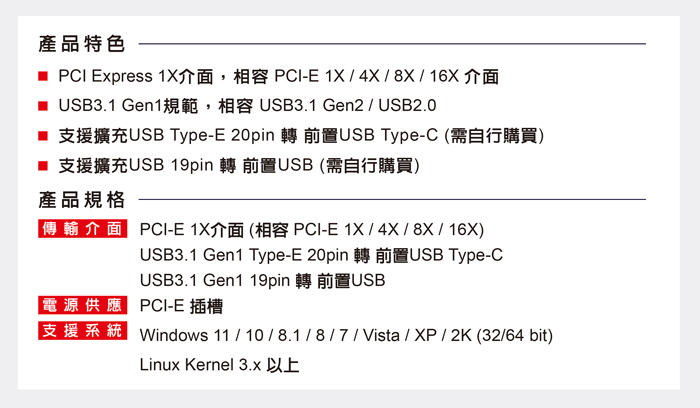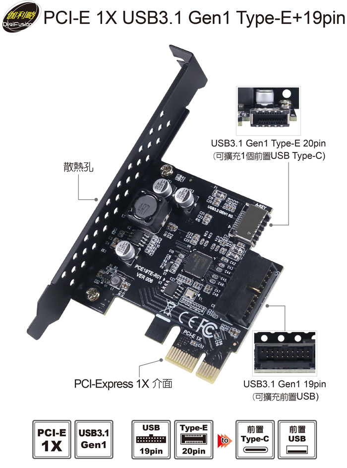 伽利略 PCI-E 1X USB3.1 Gen1 Type-E+19pin 擴充卡