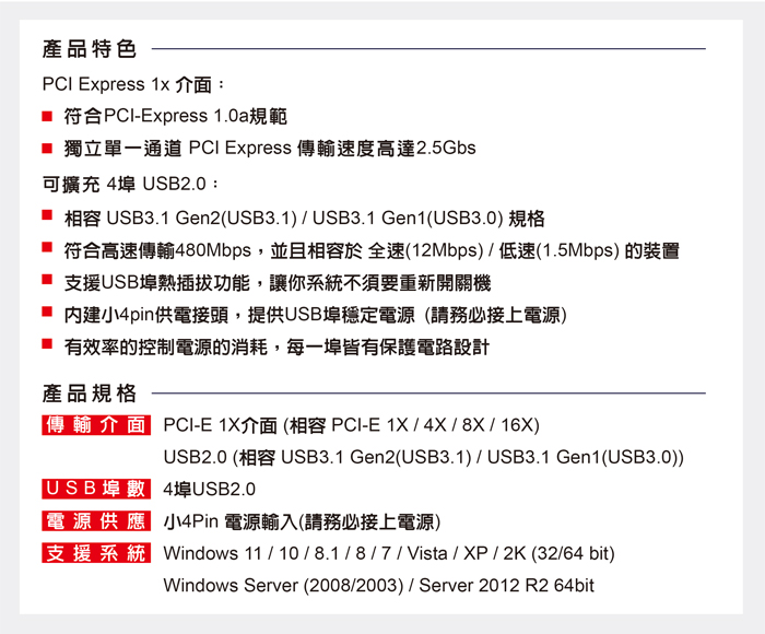 ● PCI-E 1X介面,獨立單一通道傳輸速度2.5Gbs