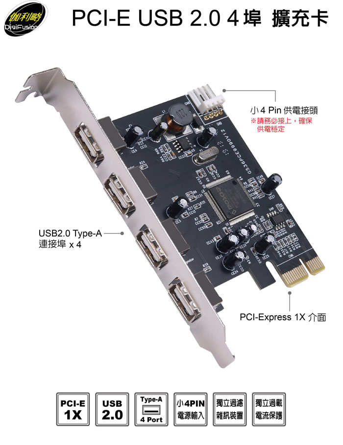 伽利略 PCI-E USB 2.0 4埠 擴充卡