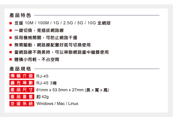 ● 支援10M/100M/1G/2.5G/5G/10G全網段
