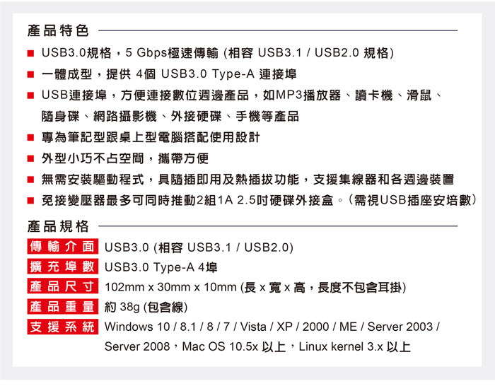 ● 無需安裝驅動程式,具隨插即用及熱插拔功能