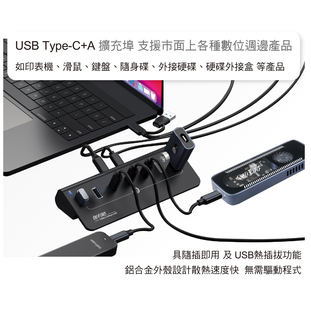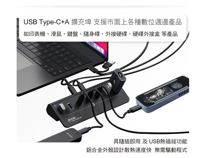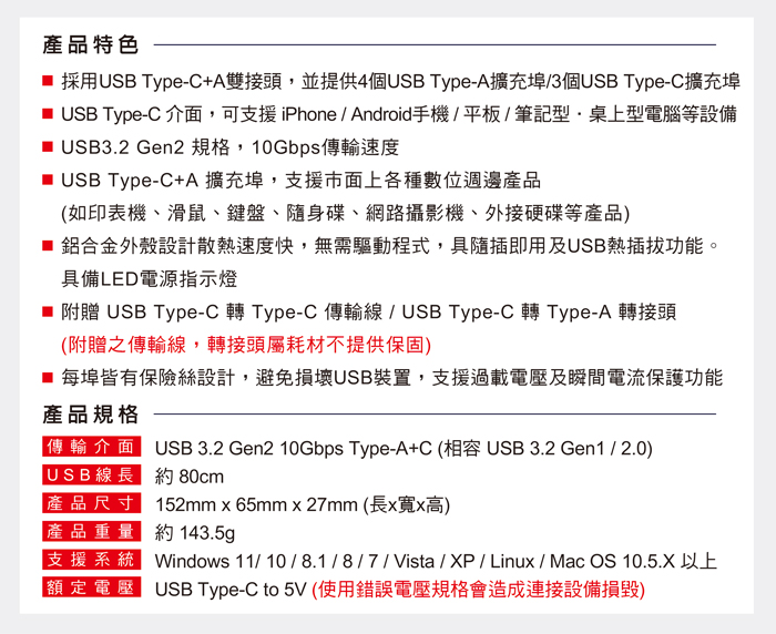 ● USB3.2 Gen2 10Gbps,USB Type-C+A雙接頭