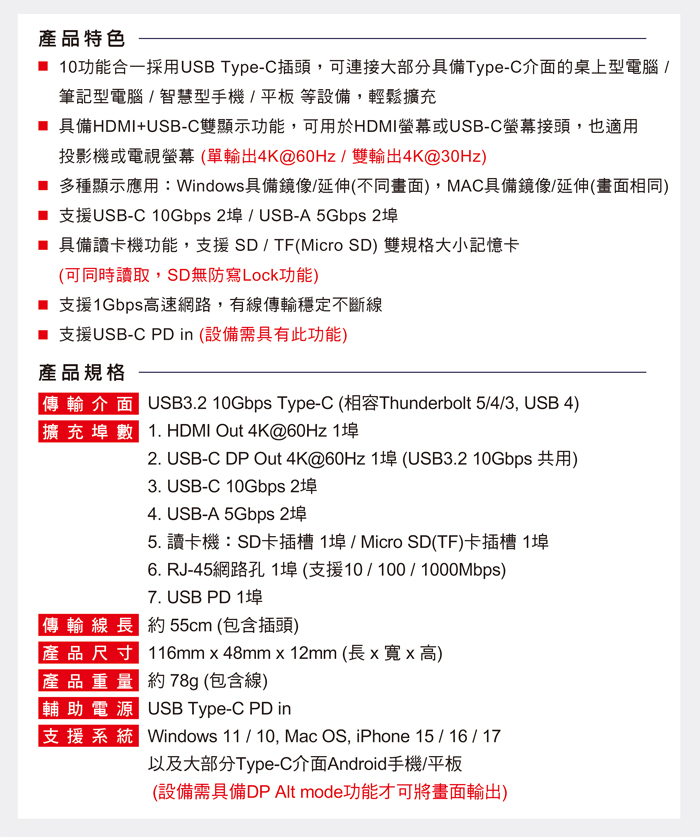 ● 10功能合一採用USB-C插頭,可連接具備Type-C介面的電腦/手機/平板