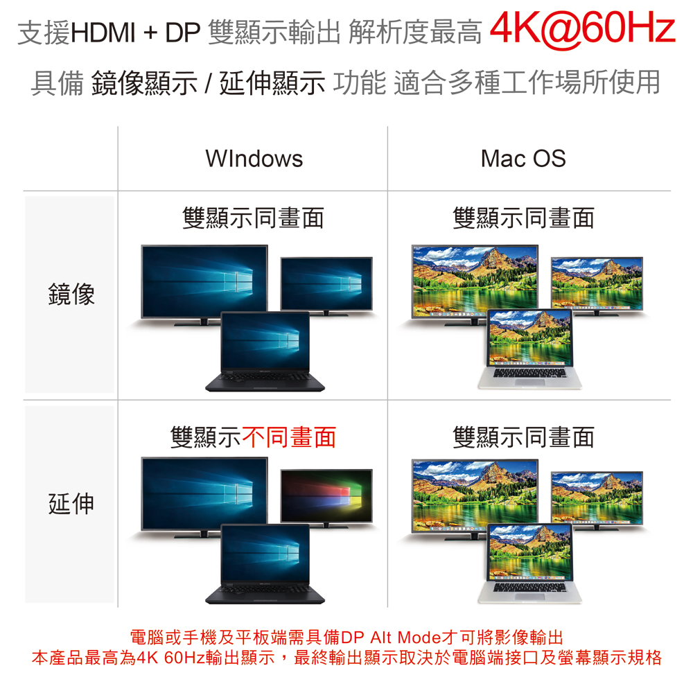 ● 具備HDMI+USB-C雙顯示功能,支援多種顯示應用