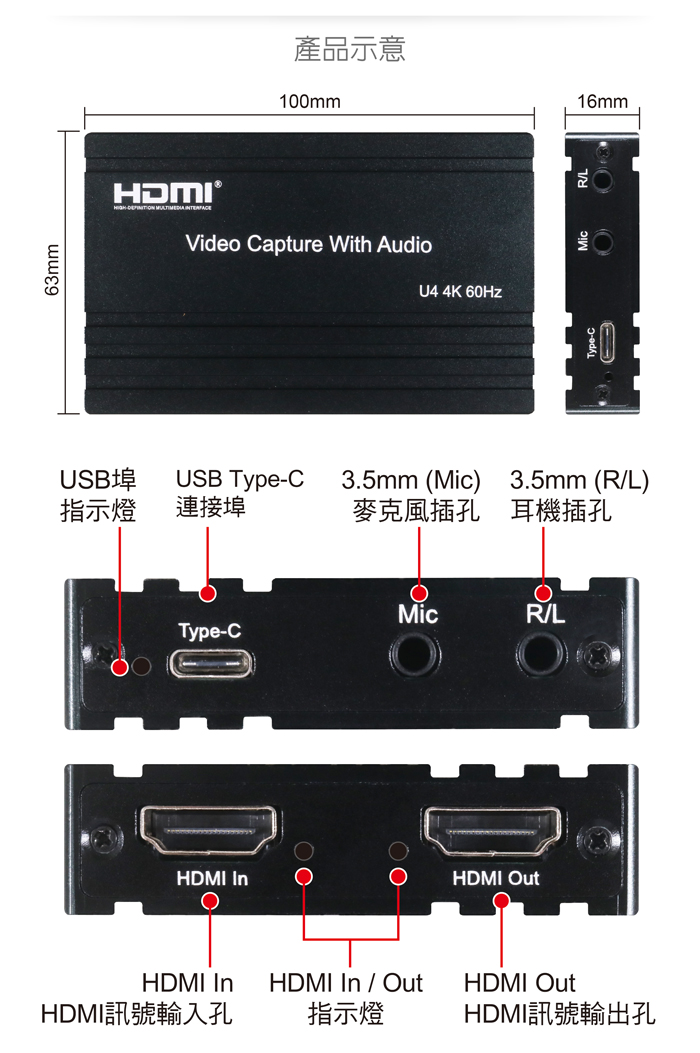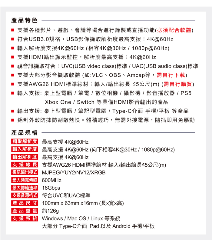 ● 符合USB3.0規格,擷取解析度最高支援4K@60Hz
