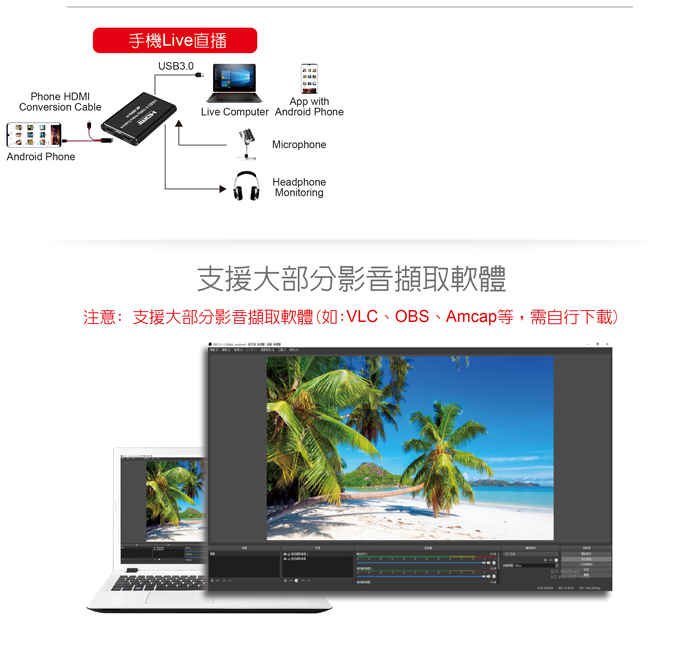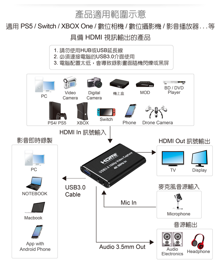 ● 支援影片、遊戲等影音進行錄製或直播(必須配合軟體)