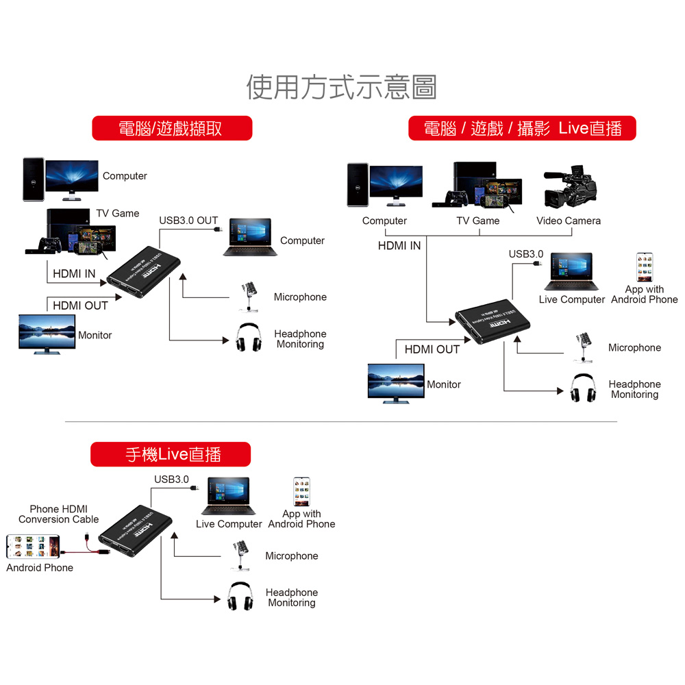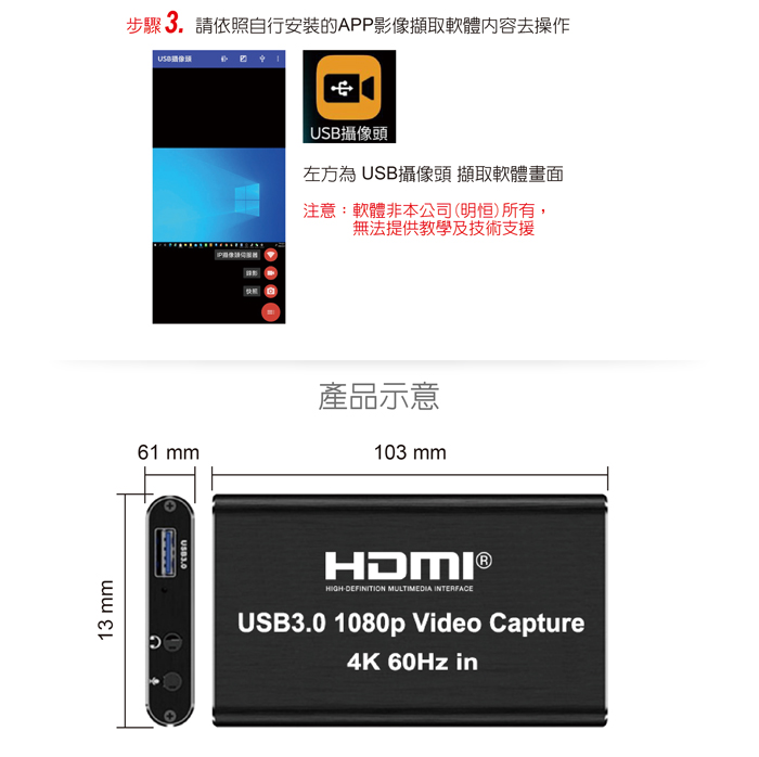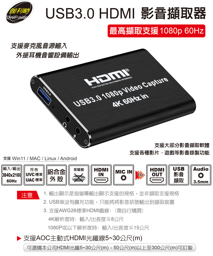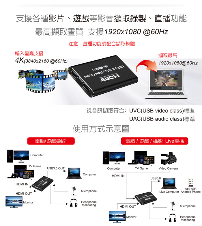 ● 符合USB3.0規格,影像擷取解析度最高 1920x1080@60Hz