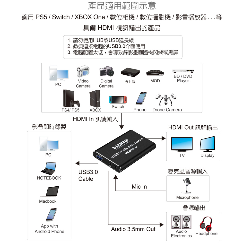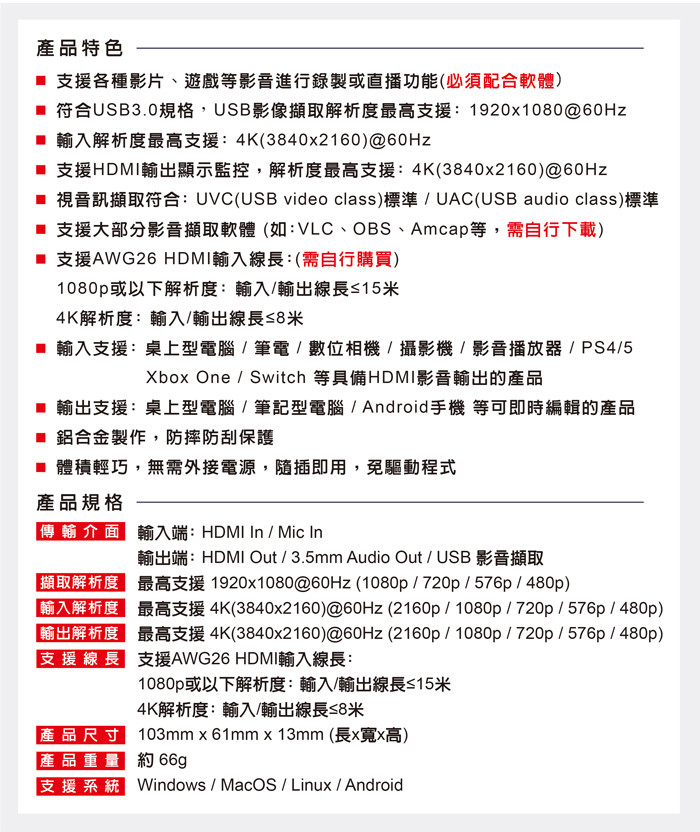 ● 輸入解析度最高4K@60Hz / 輸出顯示監控解析度最高4K@60Hz