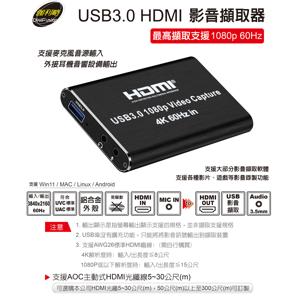 伽利略 USB3.0 HDMI 影音擷取器 1080p 60Hz (含 輸出耳機/麥克風)