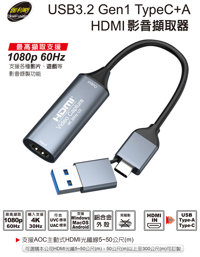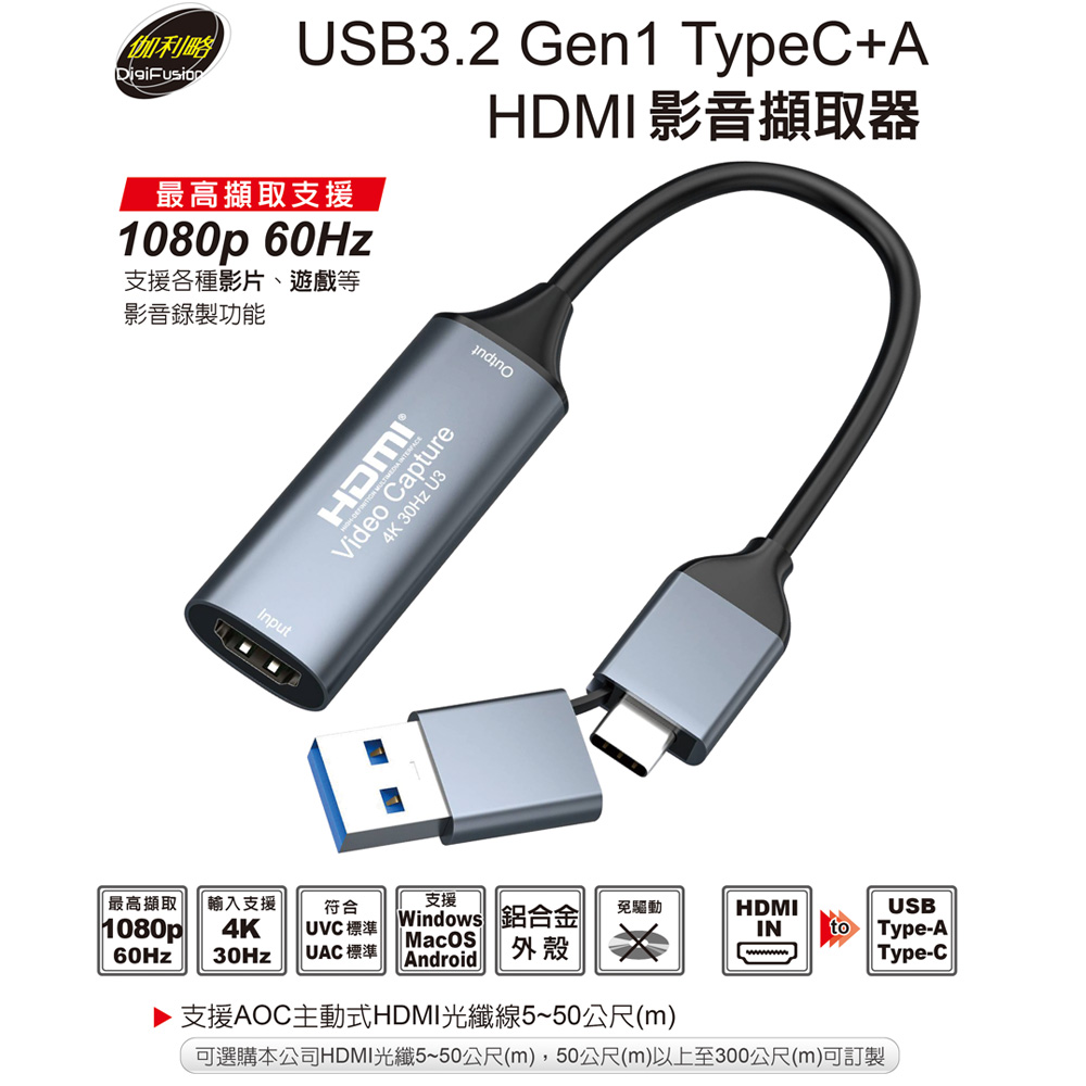 伽利略 USB3.2 Gen1 TypeC+A HDMI 影音擷取器 1080p 60Hz